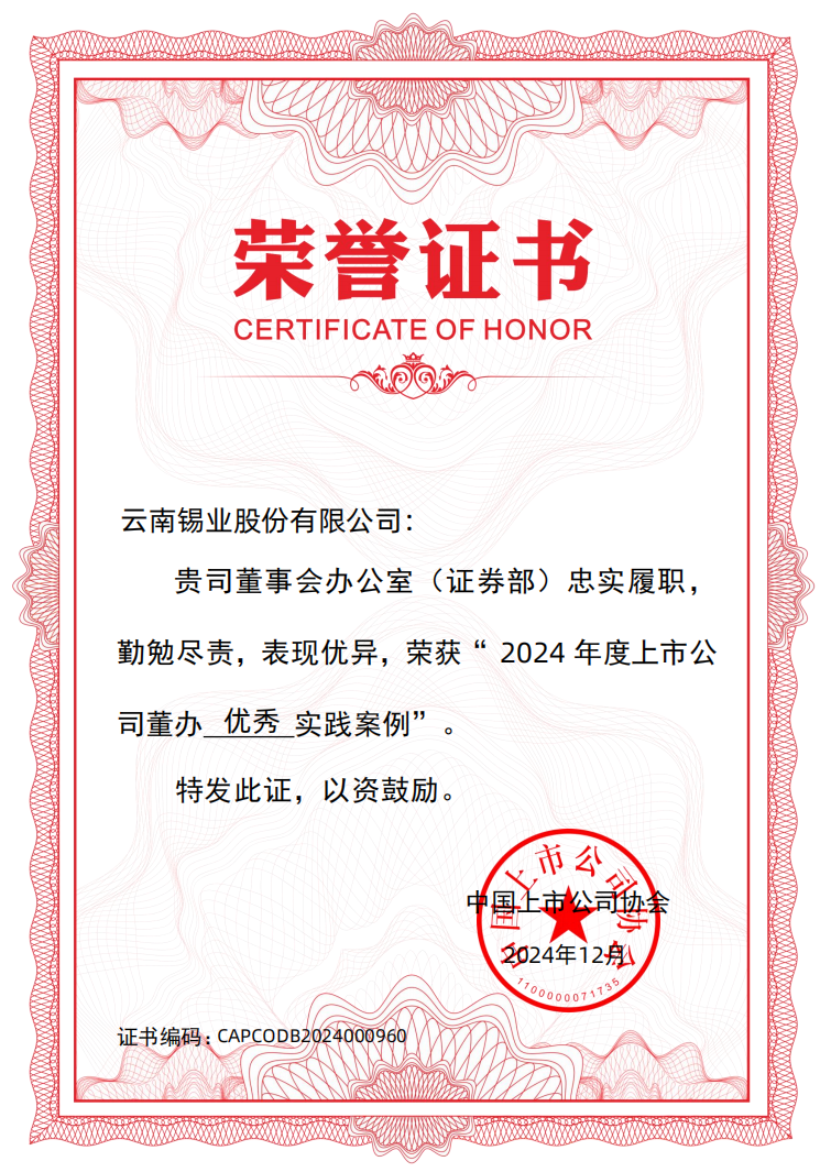 此次獲獎(jiǎng)體現(xiàn)了中國上市公司協(xié)會(huì)以及資本市場(chǎng)對(duì)錫業(yè)股份董辦工作的充分肯定和高度認(rèn)可。面向未來,錫業(yè)股份董辦將持續(xù)優(yōu)化公司治理體系,提升信息披露質(zhì)量,強(qiáng)化ESG管理水平,推動(dòng)公司高質(zhì)量可持續(xù)發(fā)展,努力為廣大股東及各利益相關(guān)方創(chuàng)造更多價(jià)值。