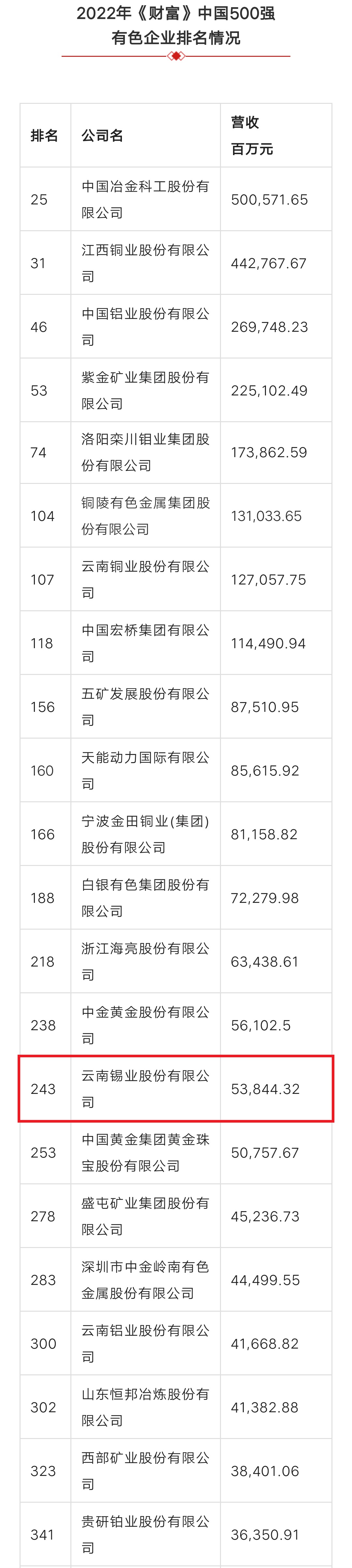 錫業(yè)股份上榜2022年《財富》中國500強位列243名