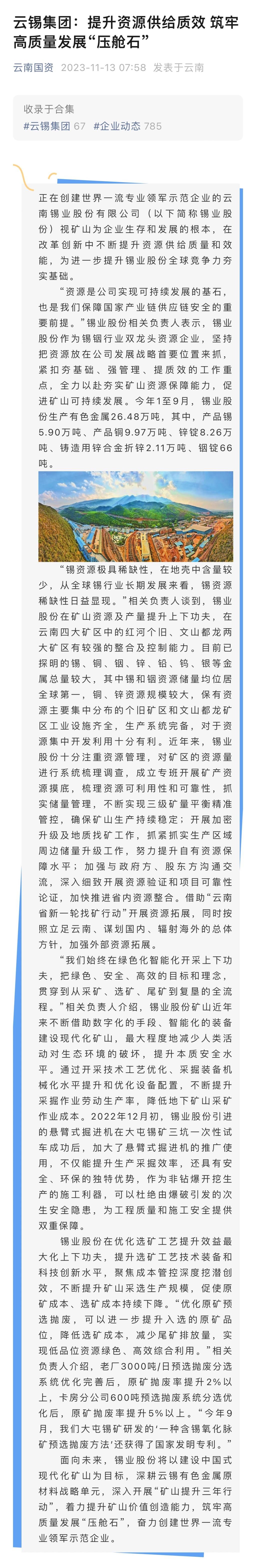 云南國資、中國有色金屬報:錫業(yè)股份提升資源供給質(zhì)效 筑牢高質(zhì)量發(fā)展“壓艙石”
