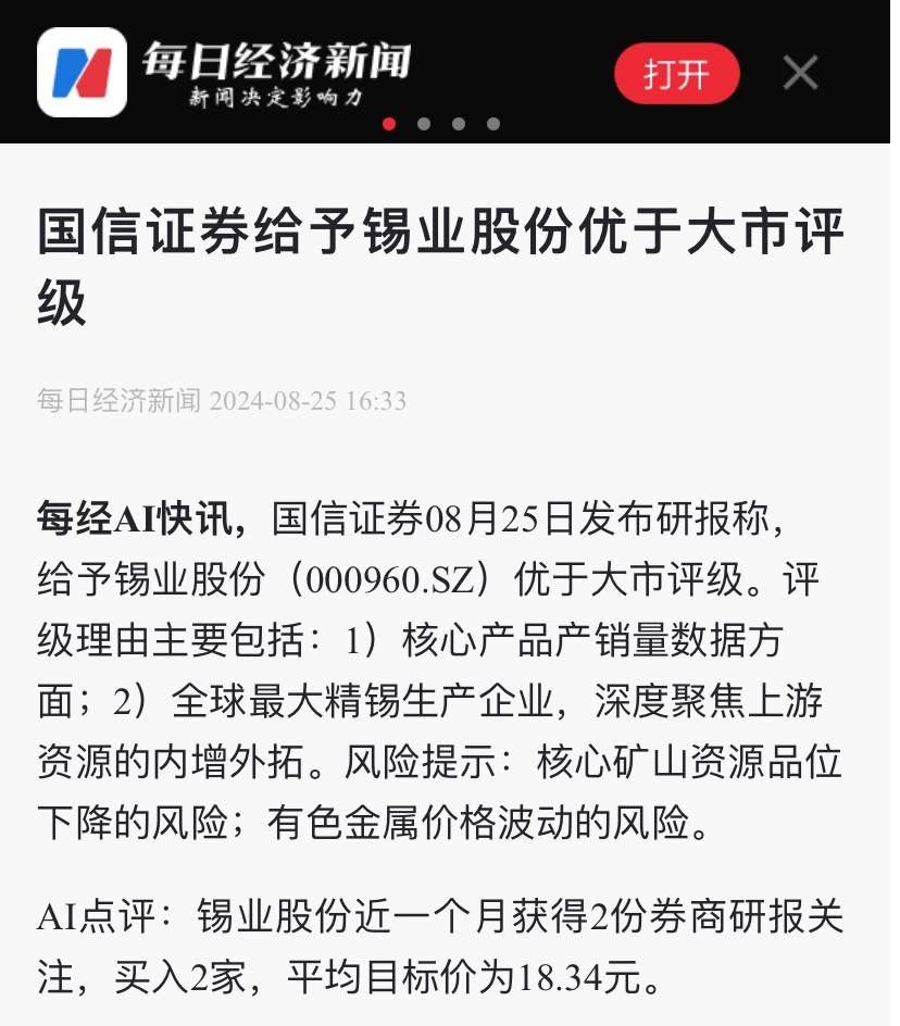 每日經濟新聞:國信證券給予錫業股份優于大市評級