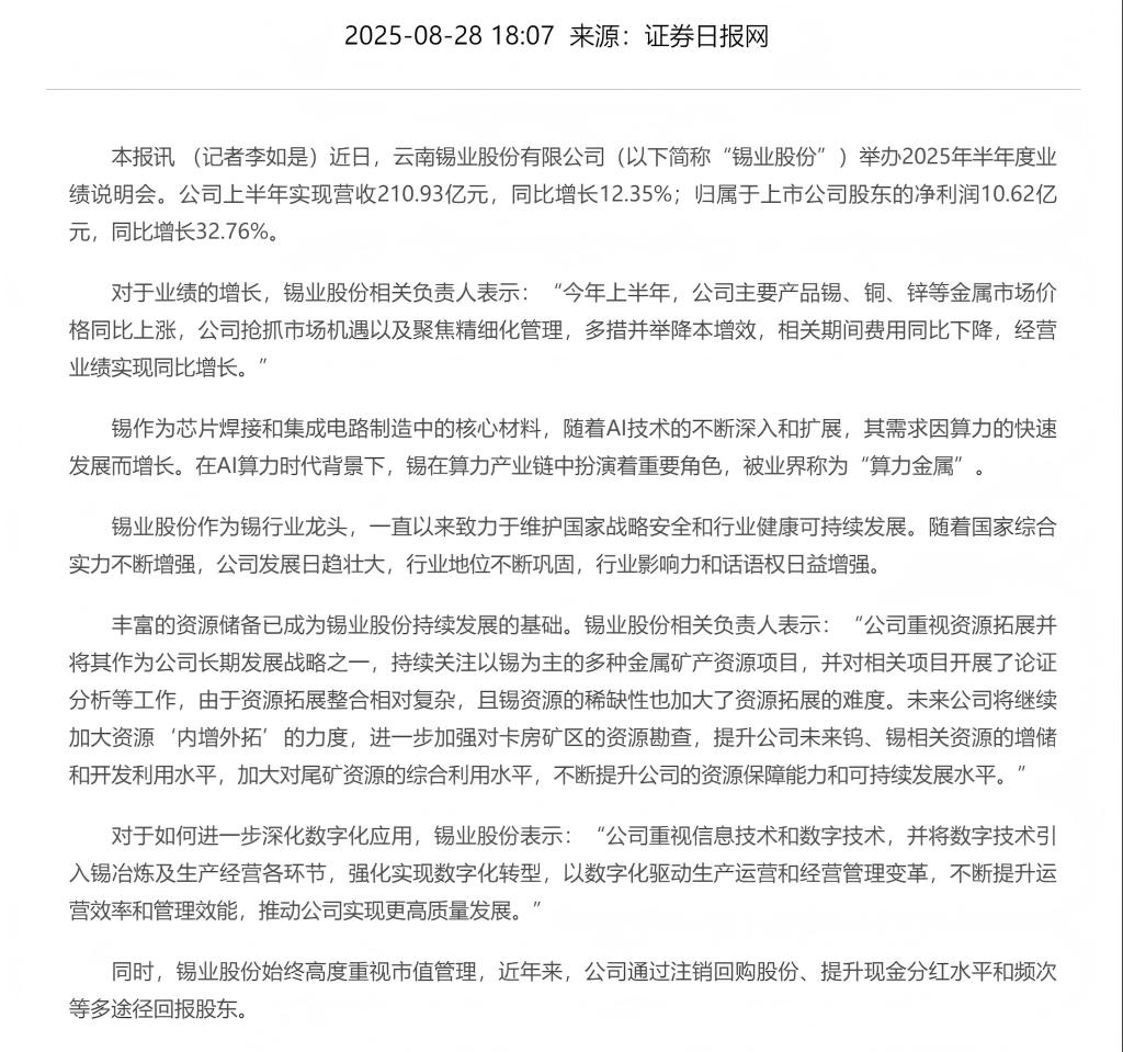 證券日?qǐng)?bào)網(wǎng):錫業(yè)股份2025半年度業(yè)績(jī)說明會(huì)——提升資源保障能力 多途徑回報(bào)股東