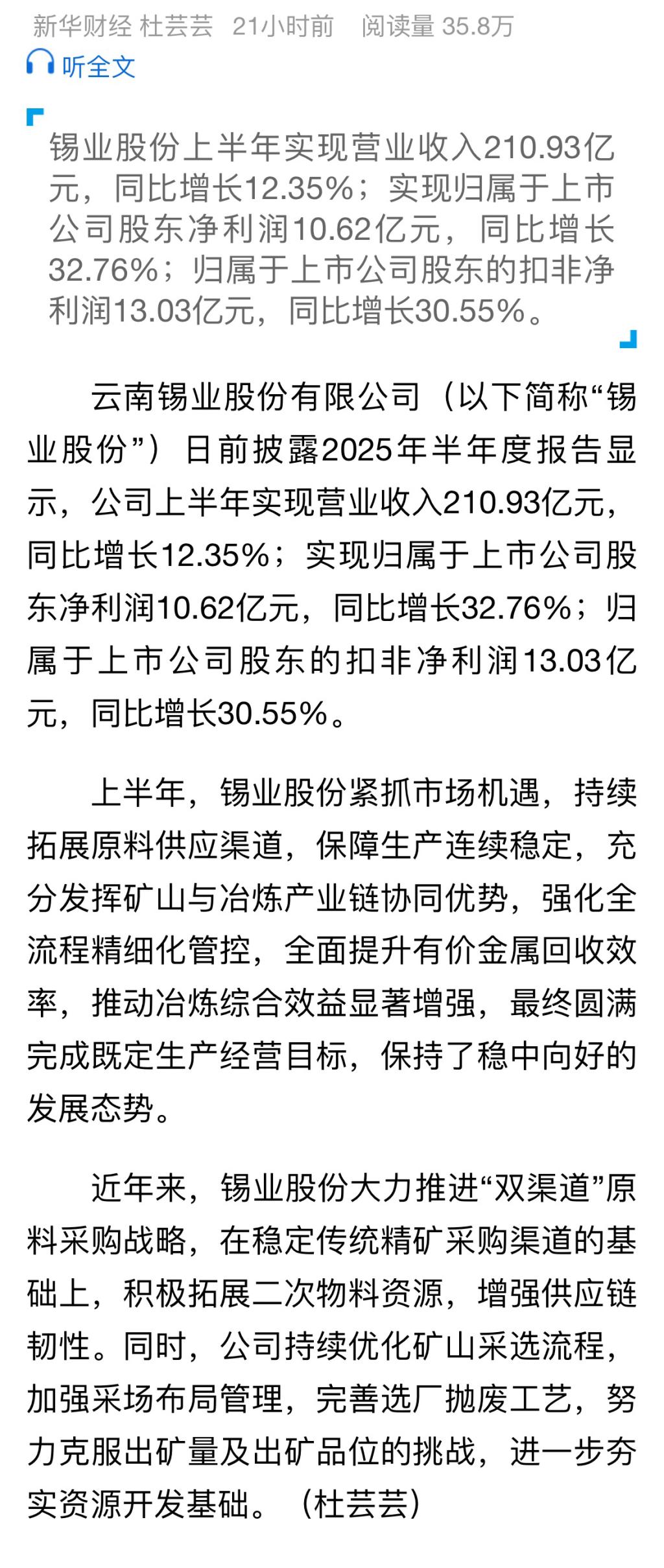 新華財經:錫業股份上半年歸母凈利潤同比增長32.76%